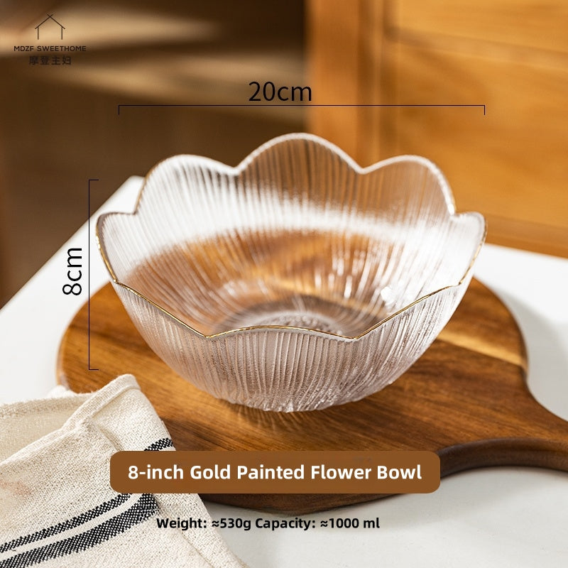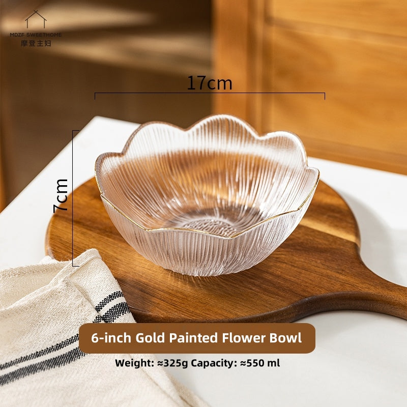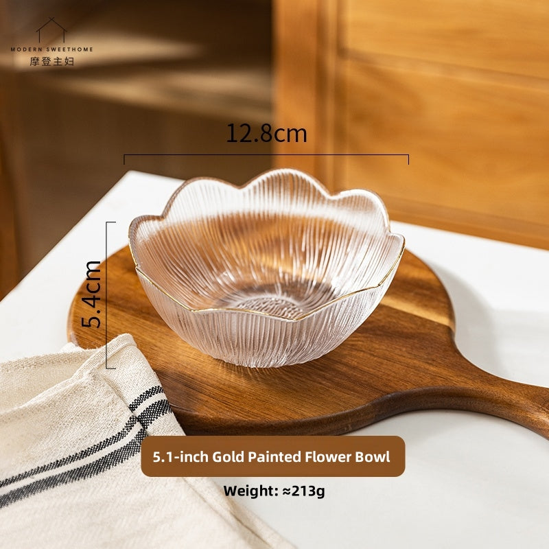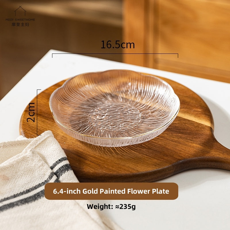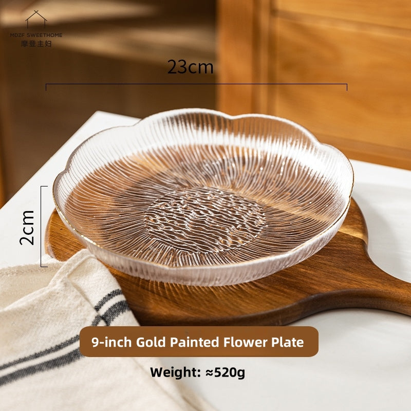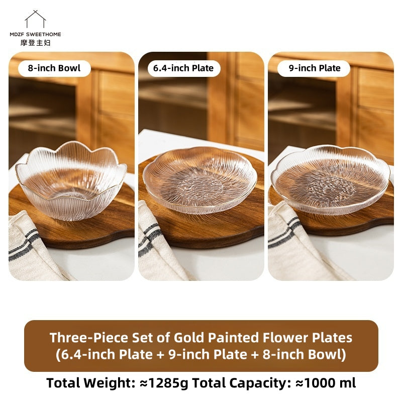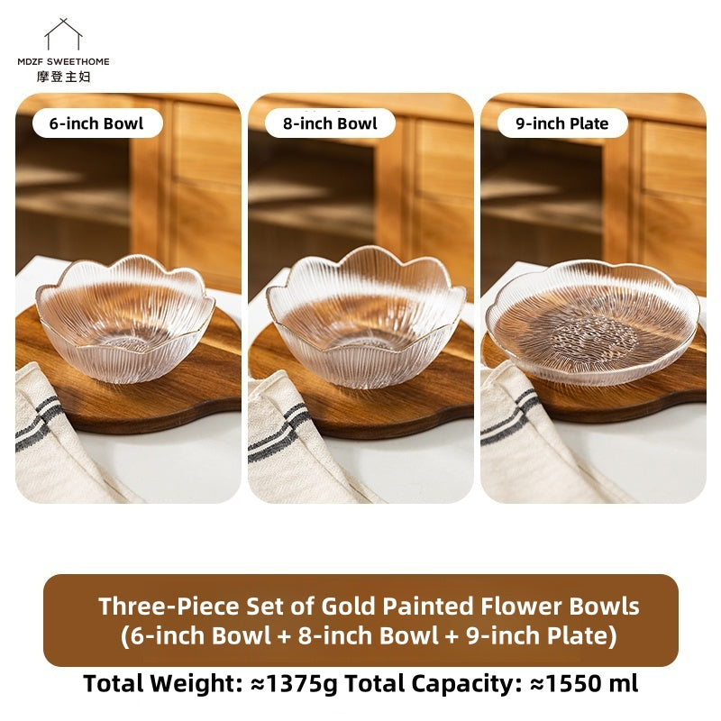 Artisan Gold-Trimmed Sodium Calcium Glass Bowls & Plates - Handcrafted Flower Language Series with Glacial Texture