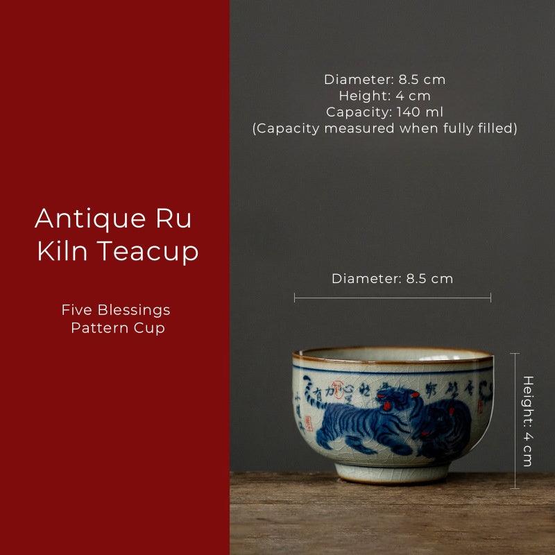 This beautiful hand-painted teacup, named "Wu Fu," showcases a traditional blue and white design that is skillfully crafted with intricate detailing. Made from high-quality natural clay, it undergoes a high-temperature firing process that enhances its durability and natural crackle glaze effect. The teacup features a lively depiction of tigers, symbolizing power and good fortune, surrounded by elegant calligraphy. The internal surface is smooth and non-porous, ensuring that it does not absorb tea flavors, making it ideal for various tea types.