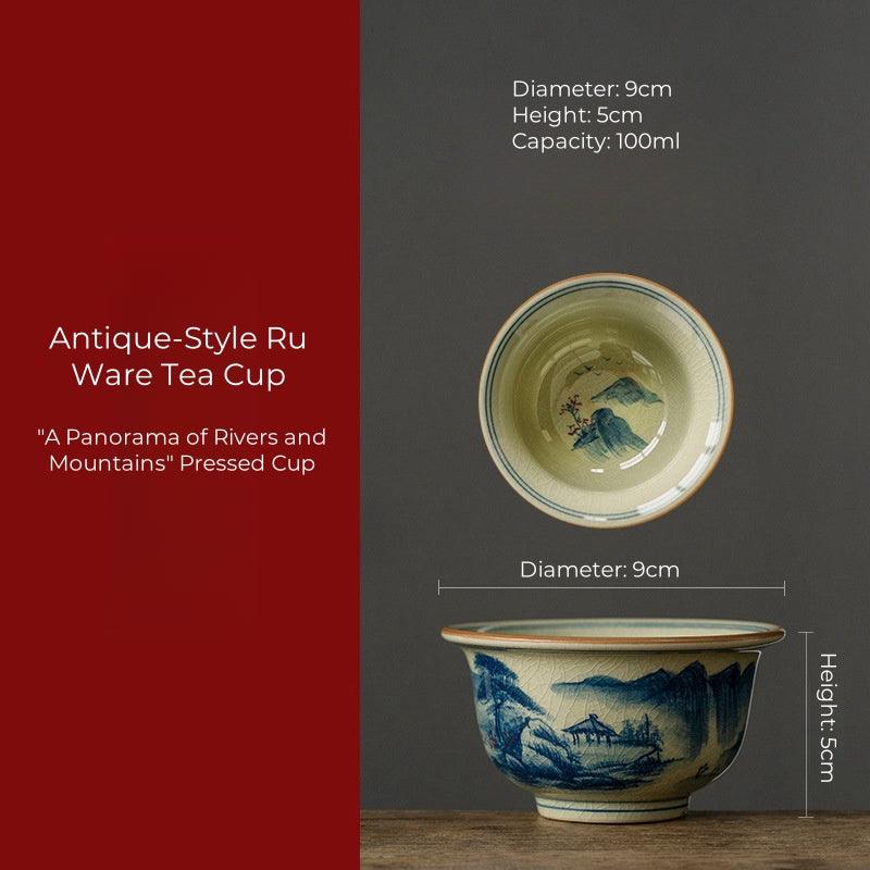 This hand-painted ceramic tea cup features a refined, traditional design inspired by ancient Chinese craftsmanship. Made from high-quality mineral clay, it undergoes a meticulous high-temperature firing process, resulting in a durable, smooth, and naturally crackled glaze that enhances with use. The hand-painted landscape of "千里江山" (Thousand Miles of Rivers and Mountains) brings a calming, artistic touch to your tea rituals.