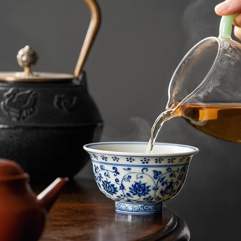 This exquisite blue and white porcelain tea cup, inspired by traditional Chinese craftsmanship, is designed for tea lovers who appreciate elegance and quality. The intricate lotus vine pattern, also known as "Wan Shou Teng," symbolizes longevity and continuous growth, adding cultural significance to each cup. Handcrafted by skilled artisans using high-temperature firing techniques, the cup features a smooth glaze with clear, delicate blue designs embedded in the porcelain.