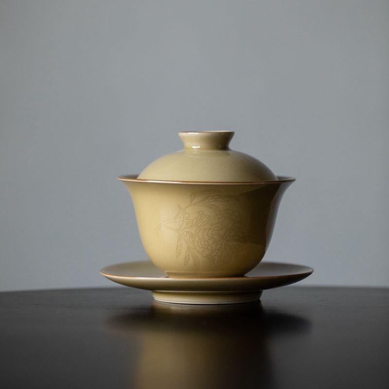 This finely crafted gaiwan, made from imitation Ding Kiln yellow porcelain, combines traditional aesthetics with a contemporary touch. It features a delicately engraved floral design, offering both beauty and functionality. Perfect for tea enthusiasts, this piece is ideal for brewing and serving your favorite teas with elegance.