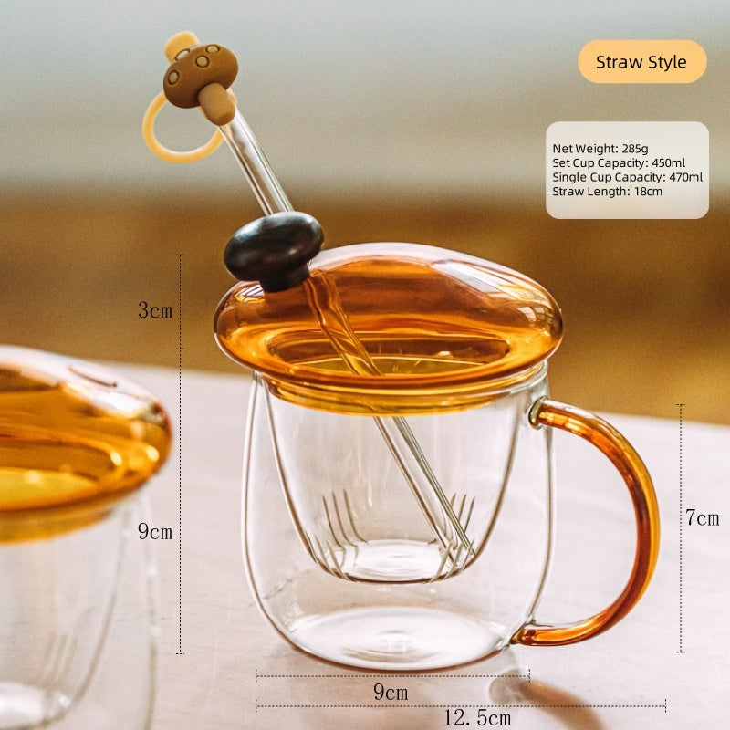 SHUEHO Mushroom Lid Borosilicate Glass Teacup with Infuser – 450ml Heat & Cold Resistant, Handcrafted Double-Color Design, Wooden Knob & Detachable Straw