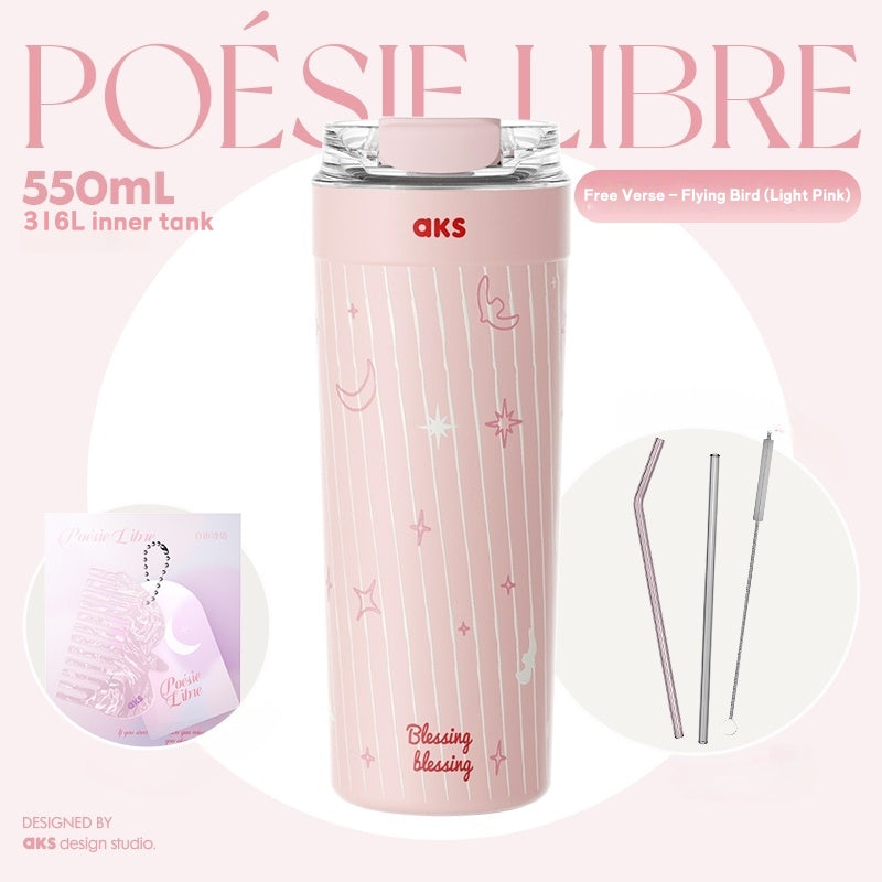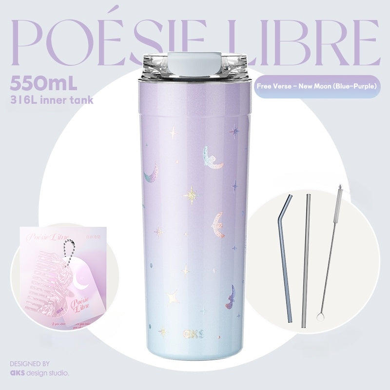 Experience ultimate versatility with the Poésie Libre vacuum-insulated travel mug. Designed for the modern lifestyle, this 550ml cup effortlessly adapts to your drinking preferences with its innovative 3-in-1 lid. Sip through the included high borosilicate glass straw, enjoy a quick pour from the wide mouth, or drink directly from the secure flip-top lid. Freedom has never tasted so good.