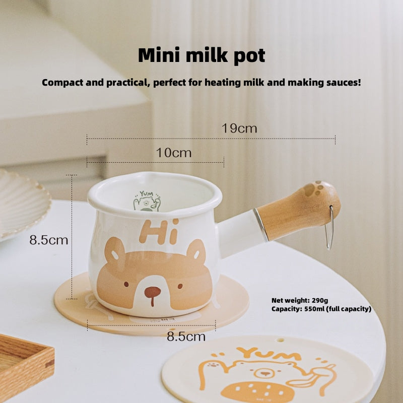 Shueho Bear Enamel Milk Pan – A playful yet professional-grade mini pot designed for delicate tasks! Flip its base to discover a hidden waving bear, adding whimsy to everyday cooking. Crafted with food-safe 0.8mm thickened steel (2x thicker than standard pans) and 6-layer enamel glaze (3x the industry norm), it delivers unmatched durability and a naturally non-stick, 0-heavy-metal surface resistant to acidic/alkaline foods.
